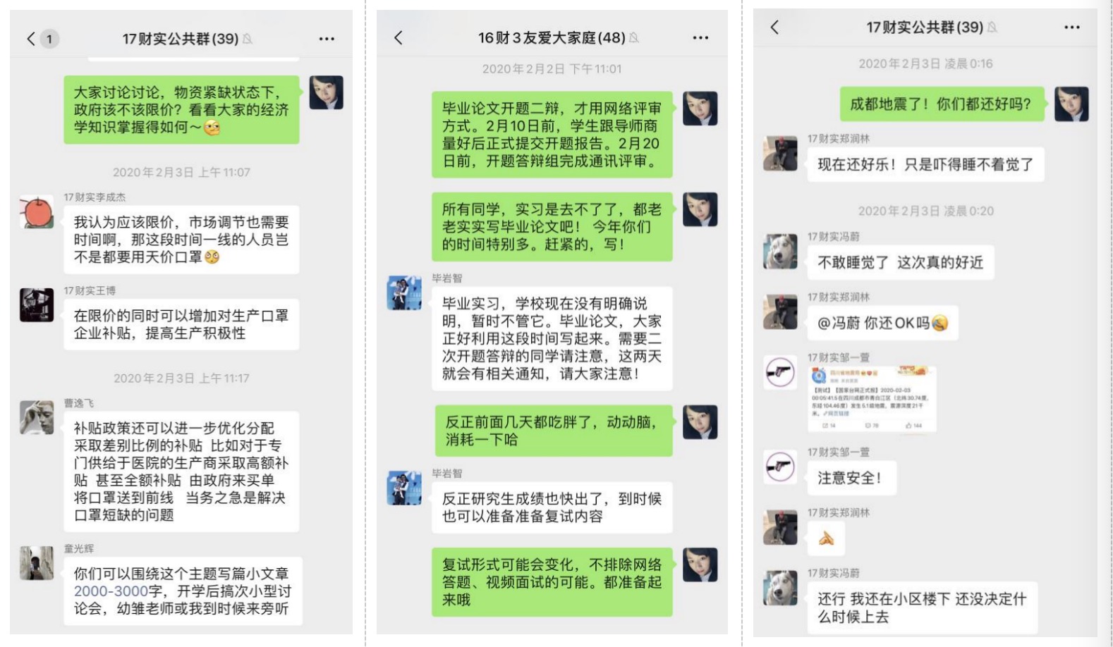 她鼓励大一和大二的同学可以利用中国大学MOOC平台,进行公共基础课和专业基础课的在线学习;对于大三的同学,则鼓励大家充分利用网课资源,准备考研、考公、考证的复习;针对大四的同学,她更多的则是安抚,缓解他们的焦虑情绪,鼓励大家利用中国知网等平台查找文献和年鉴数据资料,安心撰写毕业论文,暂时不必忧心毕业实习。此外,还结合疫情,在各班级群里鼓励学生结合专业知识展开讨论,进行线上学习。