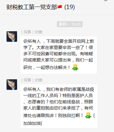 在疫情期间,作为书记,她想老师所想,急教师所急,切实关心教师健康安全。当了解到有老师在疫情严重的区域,她主动联系,密切关注他们的健康状况,反复叮嘱,安抚老师的焦虑心情,同时妥善做好隔离期间教学预案,解除老师的后顾之忧。对于有身怀六甲的老师即将临产,她持续关注其身体状况,不时分享待产及产后护理的相关经验,并在第一时间给予各种帮助,在很大程度上舒缓了该老师的紧张与不安。