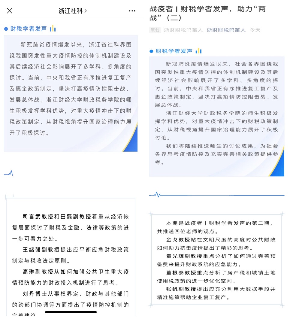 教工第一党支部副书记童光辉、党员教师高琳、教工第二党支部书记王绪强、副书记张帆等,纷纷从自身专业领域出发建言献策,为社会各界思考疫情防控及充实完善相关政策提供参考,为坚决打赢疫情防控战和经济社会发展总体战贡献财税学者的力量!
