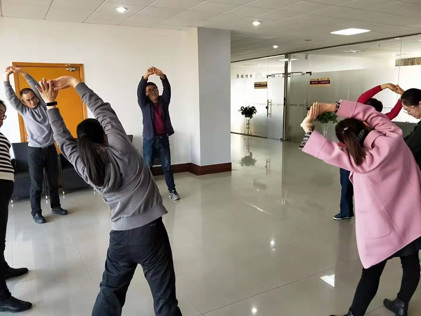 校工会派来的两位教练为各位老师演练并解释了“八段锦”。八段锦”是一套独立而完整的健身功法,起源于北宋,古人把这套动作喻为“锦”,是取其美而华贵之意,体现出了动作的舒展优美。值得一提的是,练习时亦无需器械,简单易学,很是适合久坐办公室的老师们。紧接着,两位教练开始讲解分解动作,确保老师们尽快领悟“八段锦”的要领。经过多次练习,在掌握要领之后,大家开始慢慢体会其内容:两手托天理三焦、左右开弓似射雕、调理脾胃须单举、五劳七伤往后瞧、摇头摆尾去心火、两手攀足固肾腰、攒拳怒目增气力、背后七颠百病消。这八组动作使得人身体的所有部位都得到了锻炼,对身体而言有很好的保健作用,同时也能治疗相关疾病。