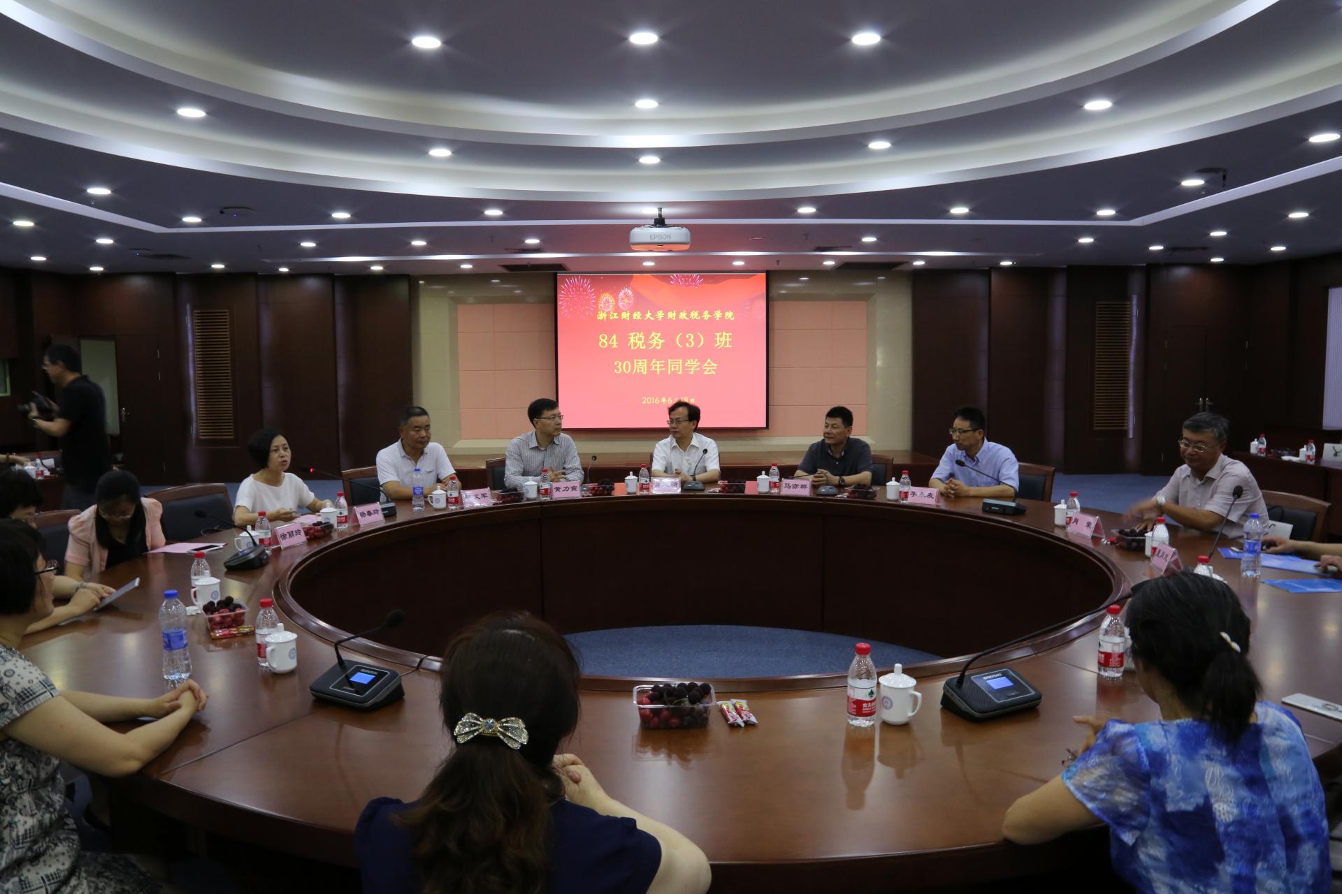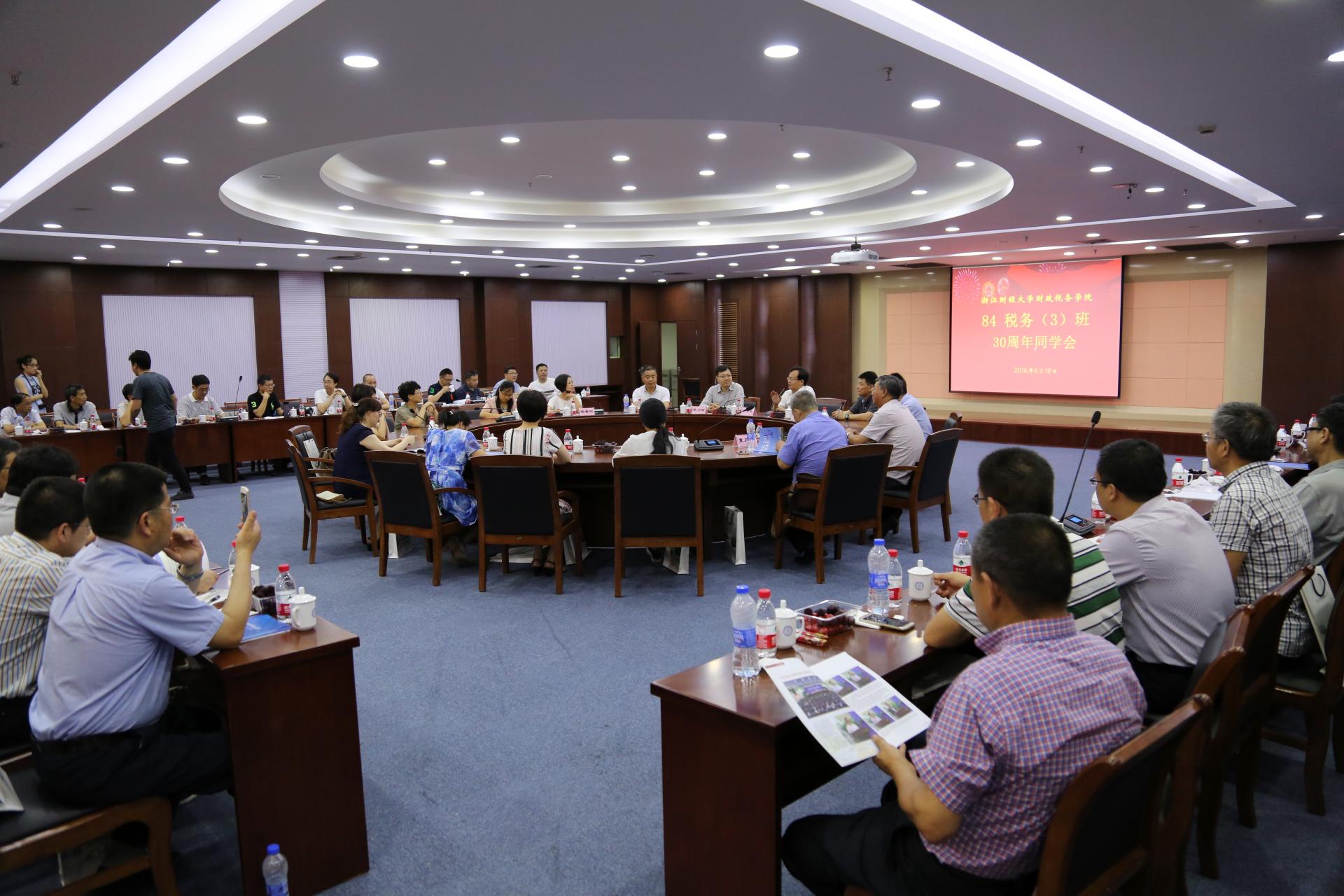 院长李永友,学院党委书记杨春玲,84税务(3)班班主任蒋文军老师,以及84税务(3)班41位校友代表出席会议,会议由院党委书记杨春玲主持。