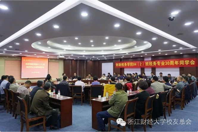 下午,84级税务2班毕业30周年校友会在学术中⼼多功能厅举行。副校长、校友总会副会长兼秘书长黄建新,校友办主任马亦群,财税学院院长李永友,学院党委书记杨春玲,学院党委副书记杨⼩恩,上海校友会会长、84级税务2班班主任黄力寅校友与84级税务2班同学一同出席了此次校友会。