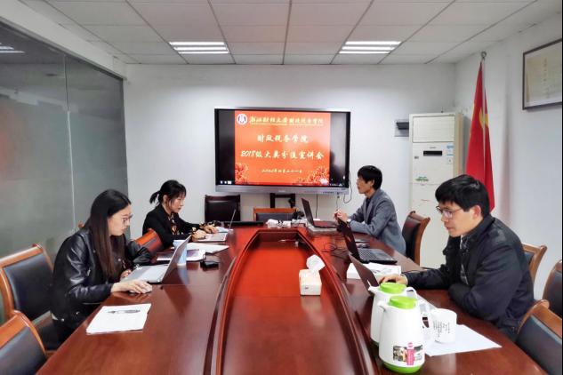 教学副院长童光辉主持,财政系副主任童幼雏、税务系主任张帆、教学办主任王婉箫出席,2018级全体学生线上观看宣讲会直播。