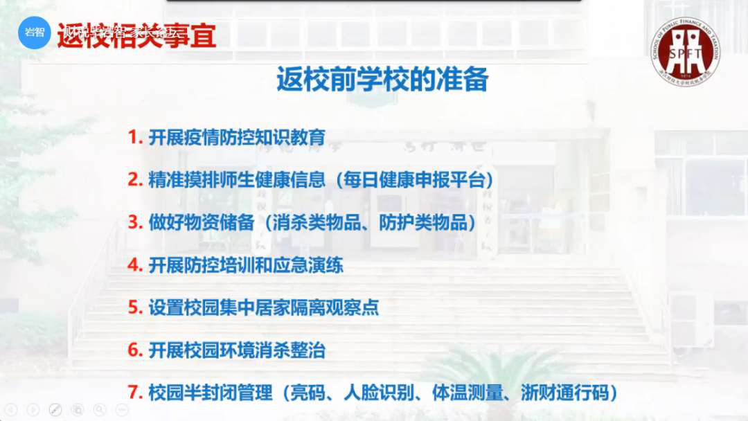 此外,在连线分享环节中,学院还介绍了近期校园疫情防控的成果,并一一解答了家长对当下返校复学的困惑,希望通过家校携手,确保学生返校复学复课工作万无一失。