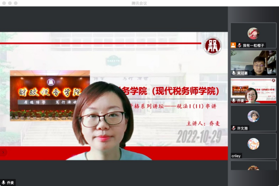邀请注册会计师、税务师乔麦(真名:胡涛)进行税务师执业资格考试知识串讲。讲座由税务系副主任黄冠豪主持,学院税务师方向班全体同学、部分教师和其他班级同学线上参与。