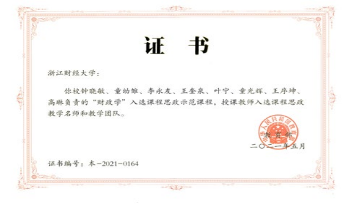 团队始终秉承“知识传授、能力培养、价值塑造”三位一体的育人理念,以课程思政为先导,一体推进“课程思政、专业思政、学科思政”,将思政教育贯穿教育教学全过程。团队在课程思政建设方面走在全国前列,构建了“全方位、立体化、嵌入式、案例式”课程思政建设体系。《财政学》获批教育部课程思政示范课程,并被列入全国高校教师课程思政培训内容;团队获批教育部和浙江省课程思政示范基层教学组织;钟晓敏等8人入选首批教育部课程思政教学名师;编写课程思政典型案例集3册,两个案例分获财政学教指委课程思政优秀教学案例一、二等奖。