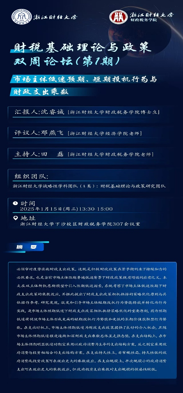 “财税基础理论与政策”双周论坛旨在通过高质量的学术交流来不断提高整个战略团队的学术水平和学术影响力,同时也为学界同仁提供高水平的学术交流机会。后续,双周论坛将不断邀请圈内学术精英来分享有关财税基础理论与财税政策的最新研究,为团队成员和浙财师生获取学术前沿资讯和学术合作机会提供帮助,并以此来推动浙财财税学科和应用经济学科的发展。