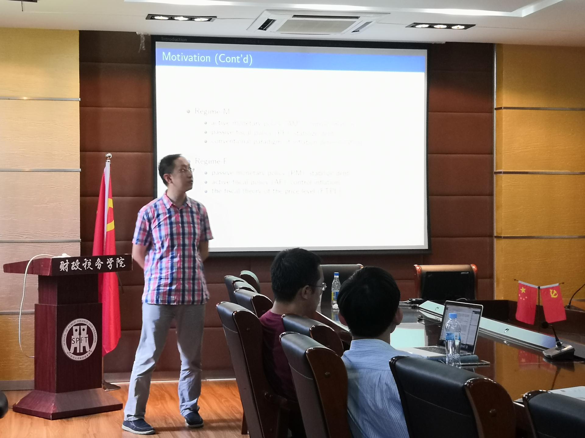 会上,李冰老师以《Credit Risk and Fiscal Inflation》为题来为大家展开叙述,提出了“通货膨胀是一种货币现象,还是从根本上说是一种财政现象”的话题。对于整合财政细节和信贷市场的摩擦,李冰老师介绍了他的论文中增加的一个标准的货币模型,从而使人们能够在财政拮据的环境中对通货膨胀进程作出两种解释。同时也讲到在模型中加入金融摩擦,会对所观察到的通货膨胀模式与金融和财政压力措施之间的关系产生重要的限制。最后,参与该讨论会的老师们就论文涉及的相关内容进行了进一步的深入探讨。