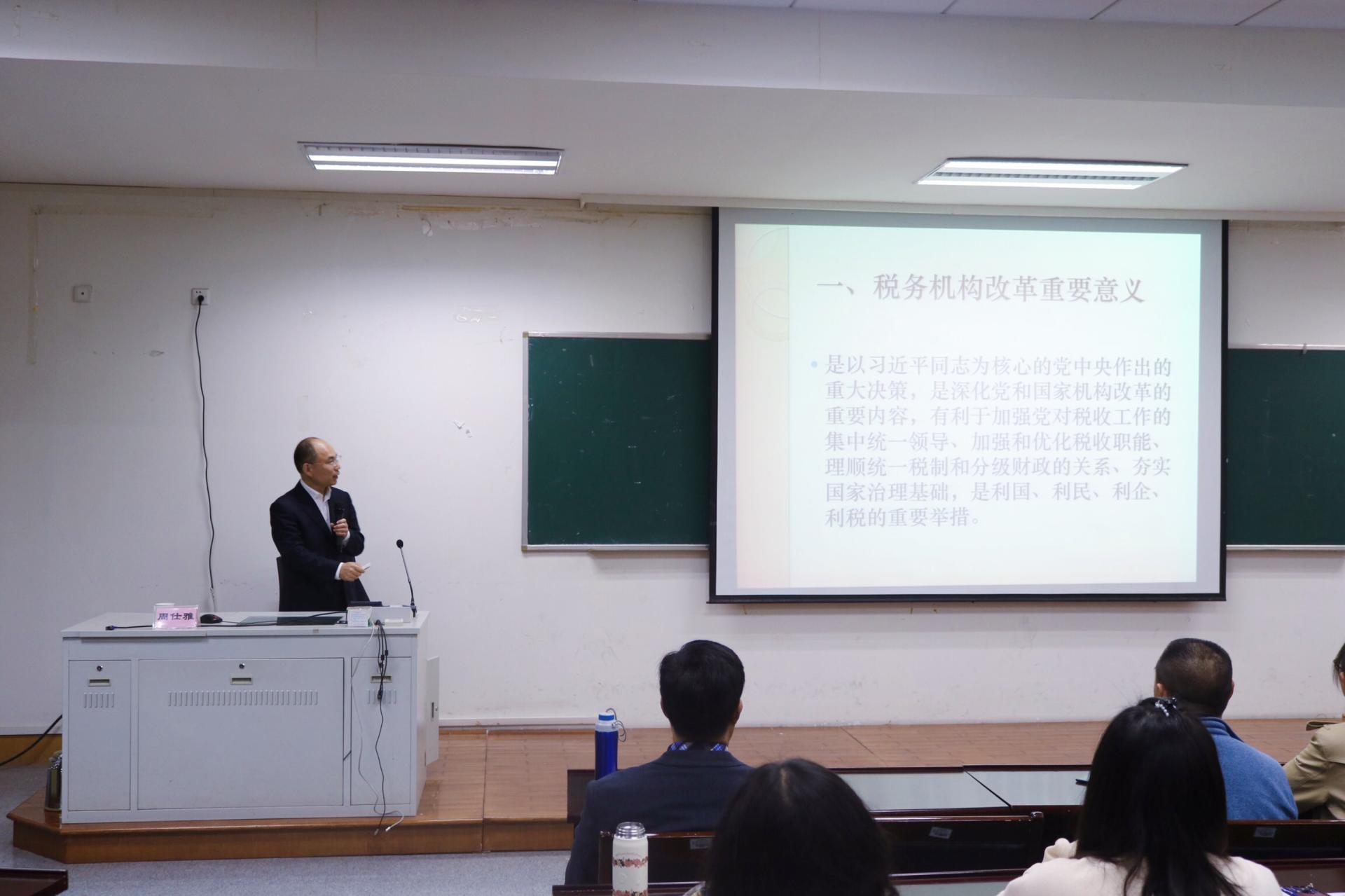 本次活动尹始,周局长总体介绍了本次讲座的四个侧重点:1.税务机构改革的意义 2.税务机构改革的整体安排 3. 税务机构改革“三场战役” 4.税务机构改革效应分析。在第一部分的讲解中,周局长给出了税务机构改革的意义,在党的领导下,各地税务机构理顺税制及财政关系有利国、利民、利企、利税的意义。