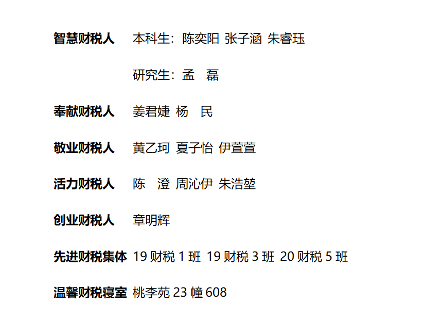 为充分发挥学生群体的青年榜样力量,进一步提升学院的良好学风,根据《包子漫画 包子漫画 “财税鸣笛人”评选标准细则》,本次“财税鸣笛人”评选活动,经学生自主申请、学院初评,结合学生申请材料、答辩现场表现及平时表现,经学院评审会讨论,最终确定陈奕阳等17名同学(或集体)获得第五届“财税鸣笛人”荣誉称号,具体名单如下:
