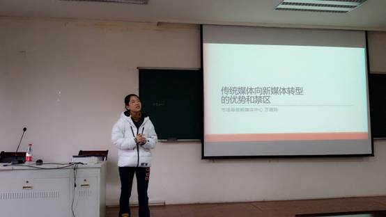 讲座伊始,万老师以《京华时报》、《中国青年报》、《东方早报》三家媒体为例,为在场学子解析了纸媒寒冬。随后,万老师结合自身经历,向大家讲述了传统媒体转向新媒体的优势,并列举了“澎湃新闻”、“咪蒙”等转型案例。