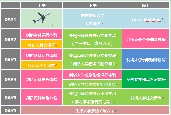 本次暑期海外课堂将邀请剑桥知名教授、学者及行业精英授课,在各个学院与外籍学生一起听取学术报告;体验剑桥小组辅导制度(Supervision),同时将安排参访牛津等英伦名校、康河泛舟、戏剧欣赏、社交舞会等丰富多彩的社交体验,参观游览大本钟、伦敦眼、大英博物馆、国会大厦等,课程结束后每位成员将获得一份结课证书,为日后申请就业添砖加瓦。